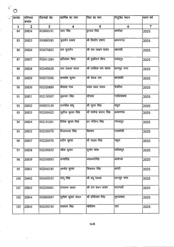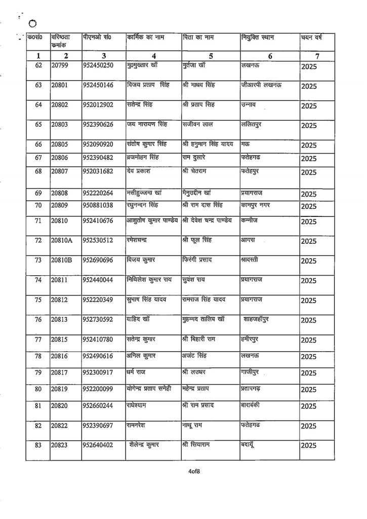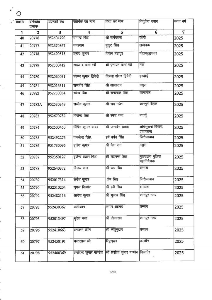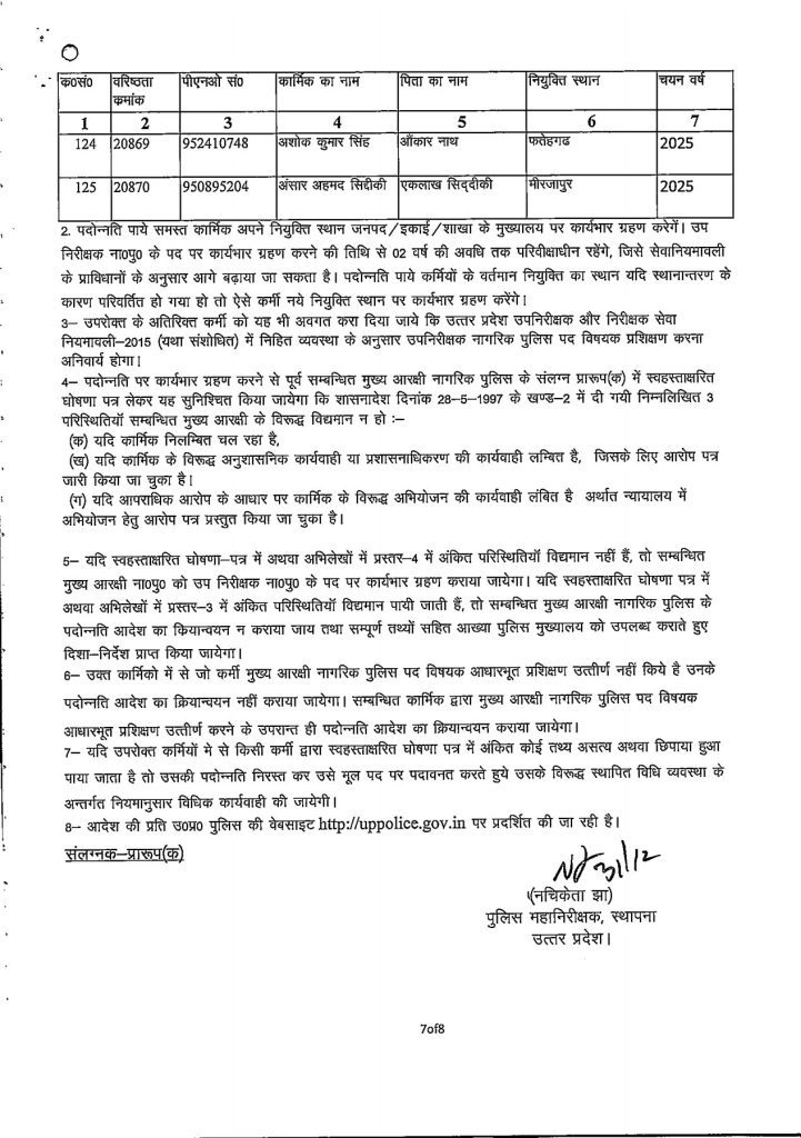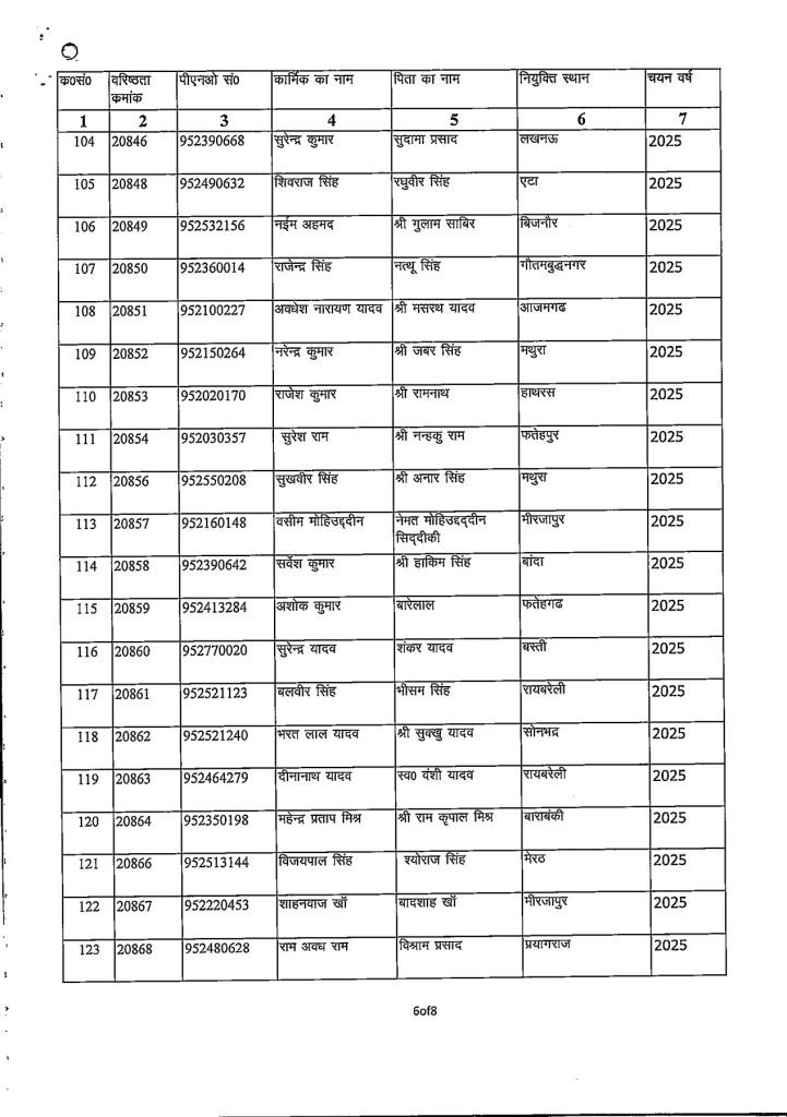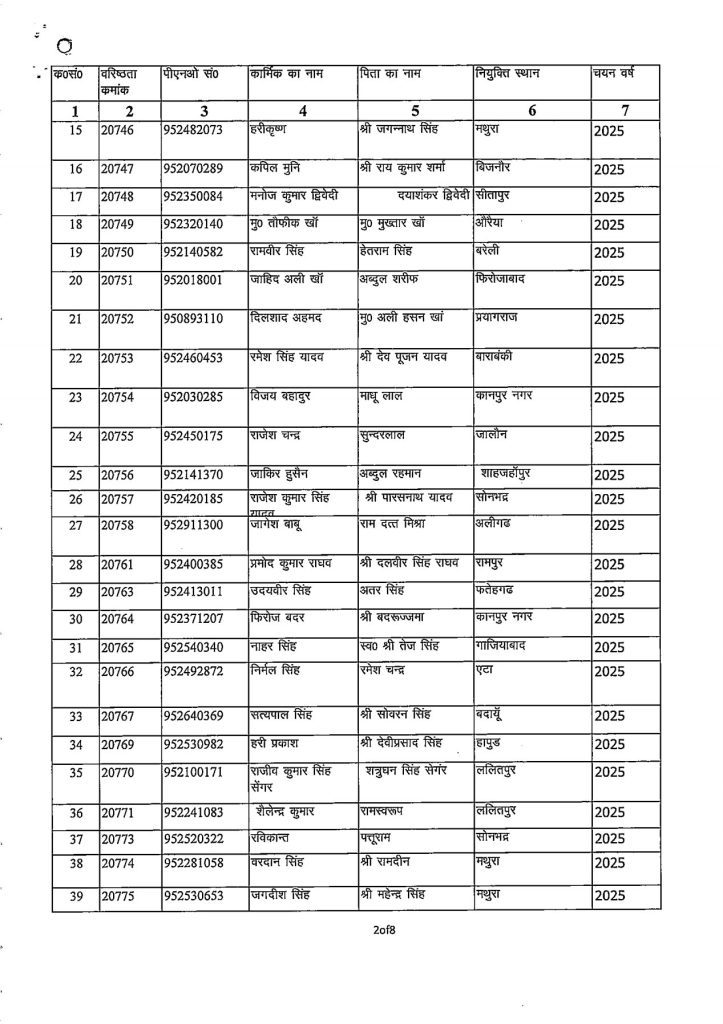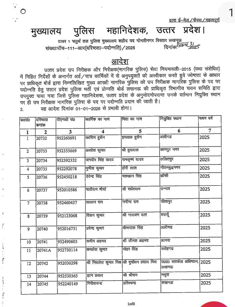 जारी आदेश के अनुसार यह पदोन्नति 01 जनवरी 2026 से प्रभावी मानी जाएगी। पदोन्नत किए गए कार्मिकों की सूची में उनके वरिष्ठता क्रमांक, पीएनओ संख्या, नाम, पिता का नाम, नियुक्ति स्थान एवं चयन वर्ष का विवरण निम्नलिखित लिस्ट में देखा जा सकता है।