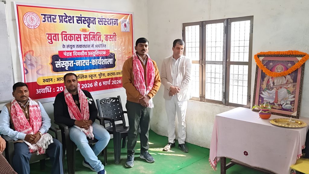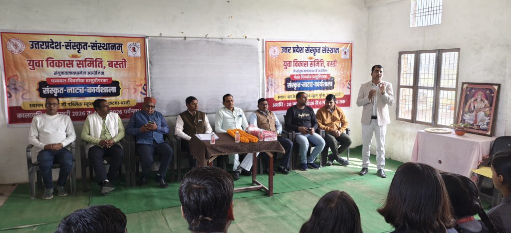 बस्ती: जनपद के पुरैना कटया स्थित आर.के.सी. पब्लिक स्कूल में उत्तर प्रदेश संस्कृत संस्थान, लखनऊ के सहयोग से युवा विकास समिति, बस्ती द्वारा 15 दिवसीय निःशुल्क संस्कृत नाट्य प्रशिक्षण कार्यशाला का शुभारम्भ मुख्य अतिथि मंगला प्रसाद मौर्य द्वारा दीप प्रज्ज्वलन के साथ किया गया। कार्यशाला में 20 प्रशिक्षु संस्कृत नाट्य की विधाओं का प्रशिक्षण प्राप्त कर रहे हैं।