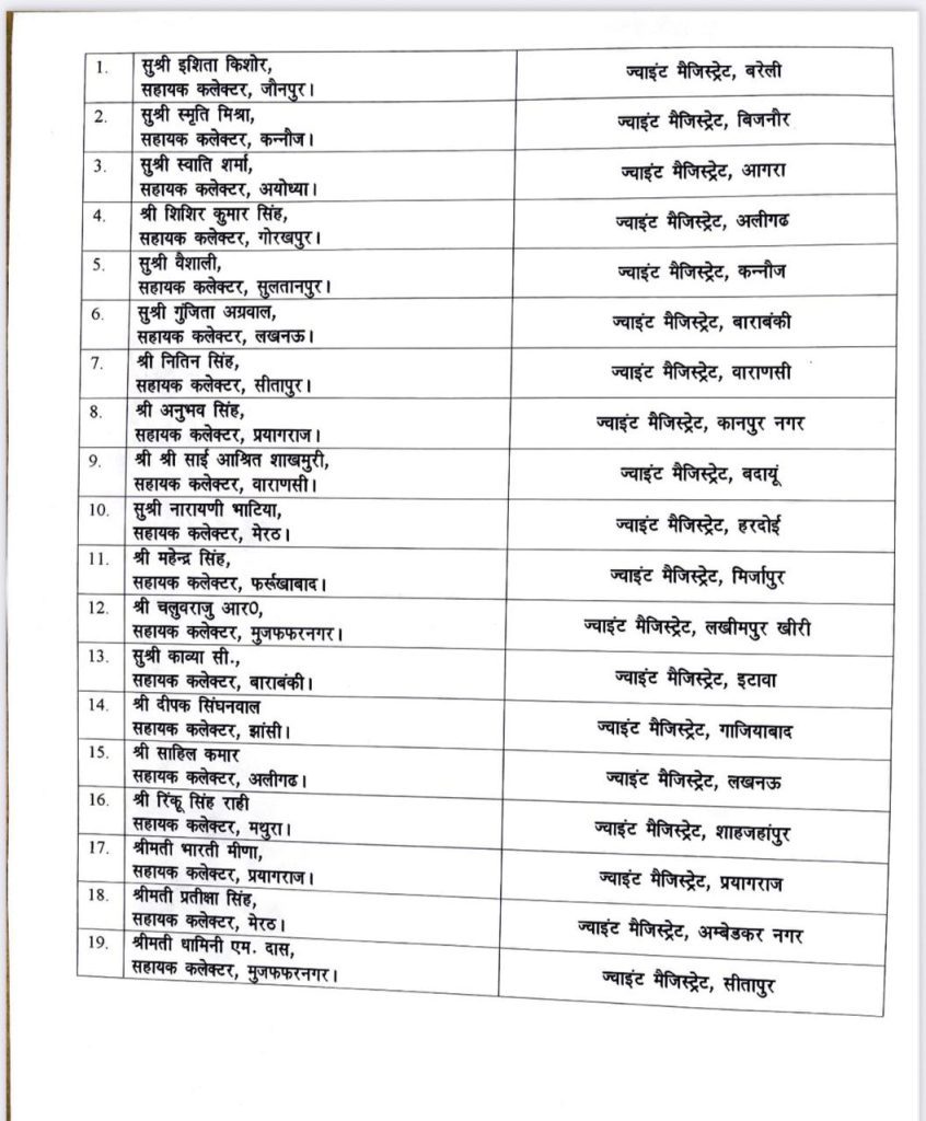 लखनऊ। उत्तर प्रदेश शासन ने भारतीय प्रशासनिक सेवा (IAS) के 2023 बैच के 19 प्रशिक्षु अधिकारियों का तबादला करते हुए उन्हें विभिन्न जिलों में ज्वाइंट मजिस्ट्रेट के रूप में तैनात किया है। ये अधिकारी अब सहायक कलेक्टर से प्रोन्नत होकर अपने-अपने जिलों में प्रशासनिक जिम्मेदारियां निभाएंगे।