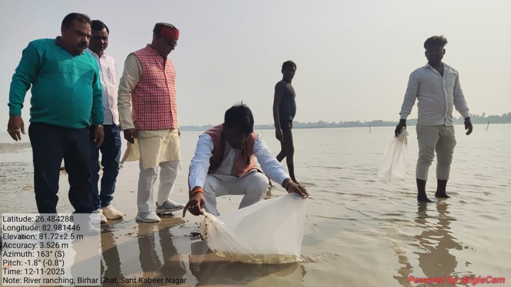 संत कबीर नगर। मुख्य अतिथि मा0 विधायक धनघटा गणेश चंद चौहान जी की उपस्थिति में आज नदियों में मत्स्य सम्पदा का संरक्षण बनाये रखने के उद्देश्य से प्रधानमंत्री मत्स्य सम्पदा योजनान्तर्गत घाघरा नदी के बीड़हर घाट संतकबीरनगर पर बुधवार को घाघरा नदी में 2.0 लाख भारतीय मेजर कार्प मत्स्य अँगुलिका का संचय किया गया।