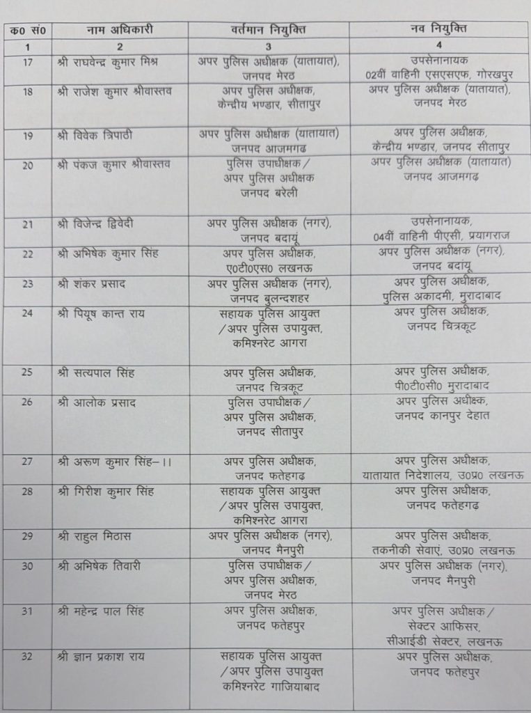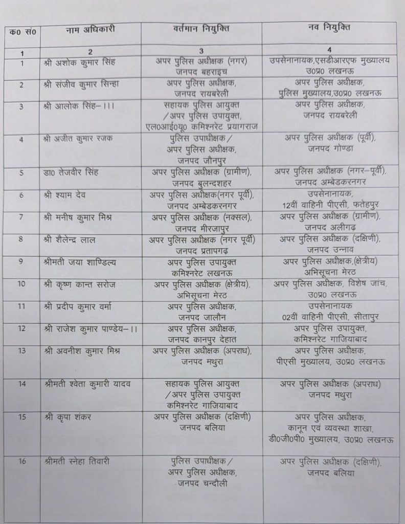 मिर्जापुर के मनीष कुमार मिश्रा को अलीगढ़, प्रतापगढ़ के शैलेन्द्र लाल को उन्नाव, तथा लखनऊ कमिश्नरेट की जया शाण्डिल्य को मेरठ में नई जिम्मेदारी दी गई है। मेरठ के कृष्ण कांत सरोज को विशेष जांच शाखा, लखनऊ में तैनात किया गया है।