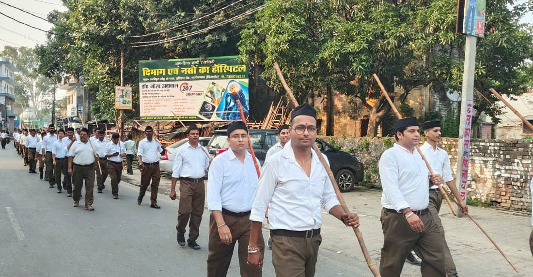 नजीबाबाद(बिजनौर)। आरएसएस के स्वयंसेवकों द्वारा विजयदशमी पर्व के उपलक्ष्य में पथ संचलन निकाला गया। हिंदूवादी संगठनों द्वारा नगर में जगह-जगह पुष्प वर्षा कर पथ संचालन का स्वागत किया गया। एमडीएस इंटर कॉलेज के प्रांगण में स्वयं सेवक व संघ के कार्यकर्ता मैदान पर एकत्र हुए। जहां उन्होंने अनुशासन का परिचय देते आरएसएस के संस्थापक केशवराव बलिराम हेडगेवार और भारत माता के चित्र के समक्ष पुष्प अर्पित कर और ध्वज वंदन के साथ उन्हें नमन किया गया।
