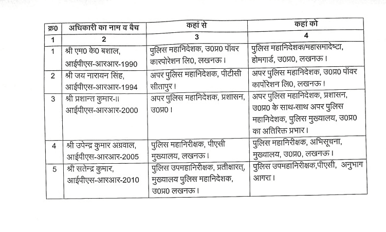 लखनऊ। उत्तर प्रदेश सरकार ने मंगलवार को पांच आईपीएस अधिकारियों के तबादले कर उन्हें नई तैनाती दी है। शासन द्वारा जारी सूची के अनुसार इन अधिकारियों की तैनाती में किया गया बदलाव:-