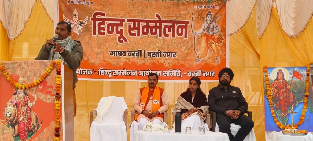 बस्ती। बस्ती नगर में माधव बस्ती आवास विकास कालोनी स्थित टीवी टावर पार्क में विराट हिंदू सम्मेलन का आयोजन किया गया। हिंदू सम्मेलन आयोजन समिति द्वारा आयोजित इस कार्यक्रम में बड़ी संख्या में सनातन प्रेमी, सामाजिक कार्यकर्ता और युवाओं ने भाग लिया। कार्यक्रम के मुख्य वक्ता वक्ता गोरक्ष प्रांत के ग्राम विकास प्रमुख सत्येंद्र जी रहे। कार्यक्रम का शुभारम्भ भारत माता के चित्र पर माल्यार्पण एवं दीप प्रज्ज्वलन से हुआ।