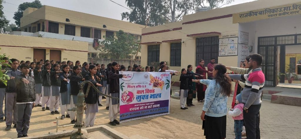 संत कबीर नगर। मा0 मुख्यमंत्री जी की मंशा के अनुसार एवं महिला कल्याण विभाग उत्तर प्रदेश लखनऊ के निर्देश के क्रम में एवं जिला प्रोबेशन अधिकारी के नेतृत्व में बुधवार को हब फॉर एंपावरमेंट ऑफ वूमेन और वन स्टॉप सेंटर टीम द्वारा राजकीय बालिका उच्चतर माध्यमिक विद्यालय बघौली एवं उच्च प्राथमिक विद्यालय बघौली में ” बाल विवाह मुक्त भारत के १०० दिवसीय ” विशेष जागरूकता कार्यक्रम का आयोजन किया गया, जिसमें बच्चों को बाल विवाह से होने वाले समस्याओं के बारे में बताया गया, बाल विवाह एक गैर कानूनी कार्य है।