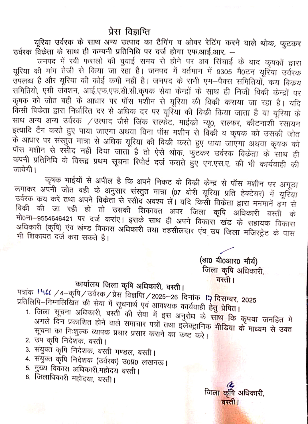 यदि किसी विक्रेता द्वारा निर्धारित दर से अधिक दर पर यूरिया की विकी किया जाता है या यूरिया के साथ अन्य अन्य उर्वरक / उत्पाद जैसे जिंक सल्फेट, माईको न्यू०, सल्फर, कीटनाशी रसायन इत्यादि टैंग करते हुए पाया जाएगा अथवा विना पॉस मशीन से बिक्री व कृषक को उसकी जोत के आधार पर संस्तुत मात्रा से अधिक यूरिया की विकी करते हुए पाया जाएगा अथवा कृषक को पॉस मशीन से रसीद नहीं दिया जाता है तो ऐसे थोक, फुटकर उर्वरक विक्रेता के साथ ही कंपनी प्रतिनिधि के विरूद्ध प्रथम सूचना रिपोर्ट दर्ज कराते हुए एन.एस.ए. की भी कार्यवाही की जायेगी।