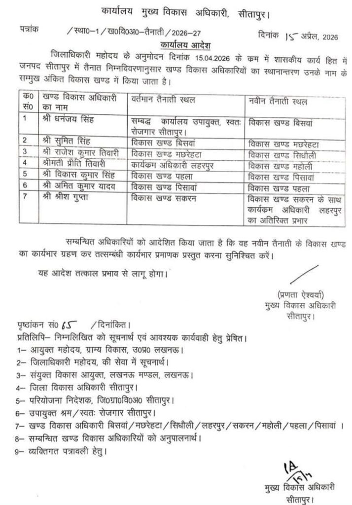 सीतापुर। जनपद में प्रशासनिक व्यवस्था को अधिक प्रभावी और गतिशील बनाने के उद्देश्य से मुख्य विकास अधिकारी (सीडीओ) प्रणता ऐश्वर्या द्वारा खंड विकास अधिकारियों के स्तर पर व्यापक फेरबदल किया गया है। जिलाधिकारी के अनुमोदन के बाद 7 खंड विकास अधिकारियों (बीडीओ) के स्थानांतरण एवं नवीन तैनाती के आदेश जारी कर दिए गए हैं।