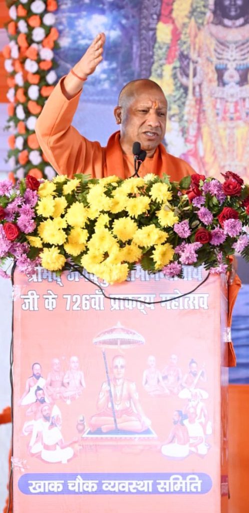 मा0 मुख्यमंत्री ने जगद्गुरु रामानंदाचार्य का जिक्र करते हुए कहा कि कोई अचानक महान नहीं बनता। महानता के लिए दिव्य गुणों को आत्मसात करने का सामर्थ्य, दृढ़ इच्छाशक्ति, दृष्टि भी होनी चाहिए। सामान्य मनुष्य केवल अपने व परिवार के लिए सोचता है, उसकी दुनिया परिवार तक सीमित रहती है, लेकिन ईश्वरीय गुणों से भरपूर महामानव की दृष्टि दिव्य, कल्याण व धर्म के प्रति जागरूक करने की होती है। उनके भाव स्वयं और स्वार्थ के लिए नहीं, बल्कि परमार्थ के लिए होते हैं। इस धराधाम पर यही कार्य जगद्गुरु रामानंदाचार्य भगवान ने किया था।