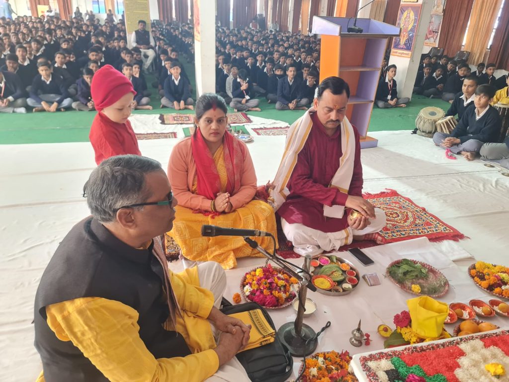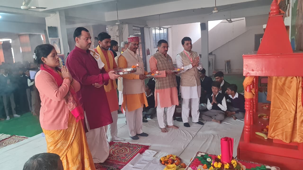 प्रातःकाल से ही विद्यालय परिसर भक्तिमय एवं आध्यात्मिक वातावरण से ओतप्रोत दिखाई दिया। कार्यक्रम का शुभारंभ विद्यालय के प्रधानाचार्य श्री गोविन्द सिंह जी द्वारा मां सरस्वती की प्रतिमा के समक्ष विधि-विधानपूर्वक पूजन एवं हवन से हुआ। पूजन कार्यक्रम को विद्यालय के आचार्य श्री उमेश कुमार पाण्डेय जी ने विधिवत संपन्न कराया। इसके पश्चात विद्यालय की वंदना टीम द्वारा मधुर भजन प्रस्तुति की गई, साथ ही हवन, मां सरस्वती की आरती एवं प्रसाद वितरण किया गया।