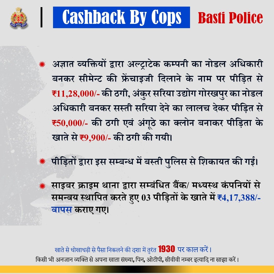 - साइबर थाना बस्ती ने ₹3,57,488 की धनराशि वापस कराई।