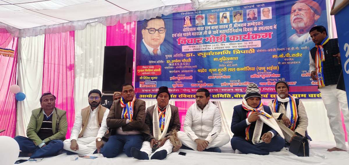 बस्ती। भारत रत्न संविधान निर्माता बाबा साहब और महान संत गाडगे के परिनिर्वाण दिवस के उपलक्ष्य में रविवार को नगर पंचायत मुण्डेरवा के अम्बेडकर नगर बोदवल में संत रविदास सेवा समिति अध्यक्ष प्रदीप कुमार भारती, वेदमणि, अमर चन्द्र, अनिल कुमार, सूर्यलाल, माधव मुरारी, प्रवीन कुमार कन्नौजिया, नन्द किशोर नन्दू और अरविन्द के संयोजन में संगोष्ठी का आयोजन किया गया।