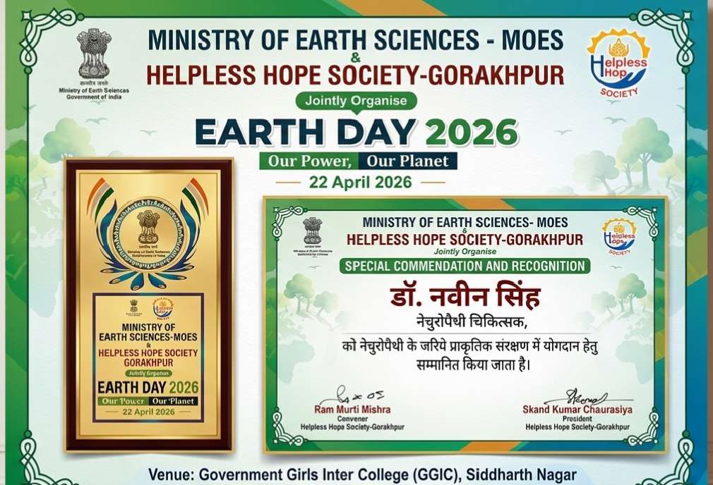 डॉ. नवीन सिंह का योगदानइस विशेष अवसर पर नेचुरोपैथी चिकित्सक डॉ. नवीन सिंह को प्राकृतिक संरक्षण और पर्यावरण के प्रति उनके उल्लेखनीय कार्यों के लिए सम्मानित किया गया। डॉ. सिंह को यह सम्मान पृथ्वी विज्ञान मंत्रालय (Ministry of Earth Sciences – MoES) और हेल्पलेस होप सोसाइटी, गोरखपुर द्वारा संयुक्त रूप से दिया गया।