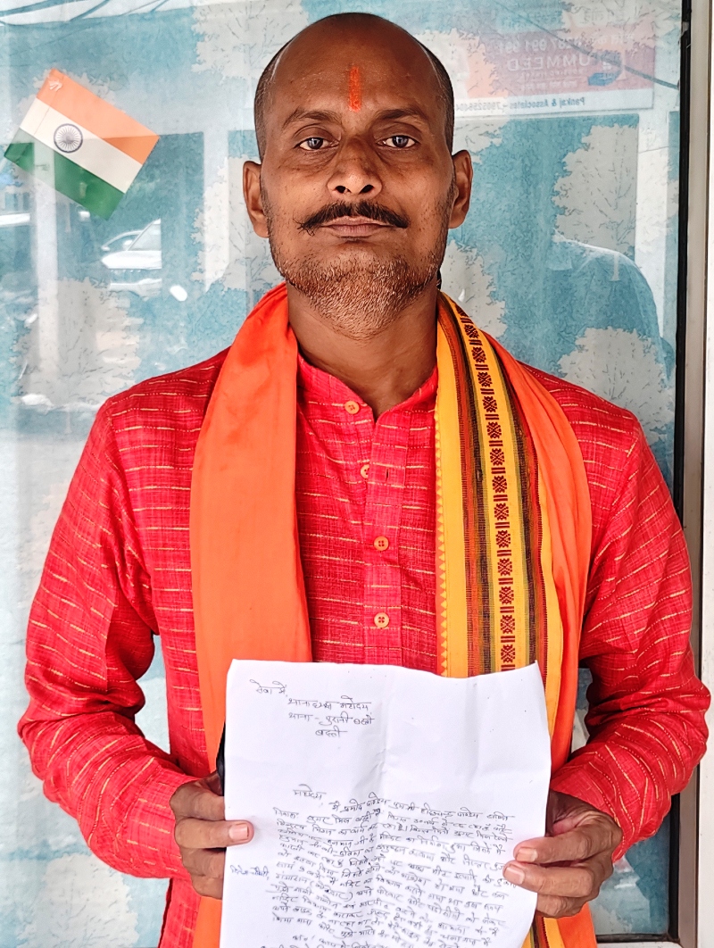 कहा कि शनिवार 6 सितम्बर की रात्रि लगभग 9 बजे जब वे मंदिर पर विश्राम कराने गये थे तो दिनेश चौधरी, गंगाराम कोटेदार ने उन्हें गालियां दी और मारपीट पर आमादा थे किन्तु वे घर चले गये। उक्त लोग उन्हें मारने-पीटने की योजना बना रहे हैं।