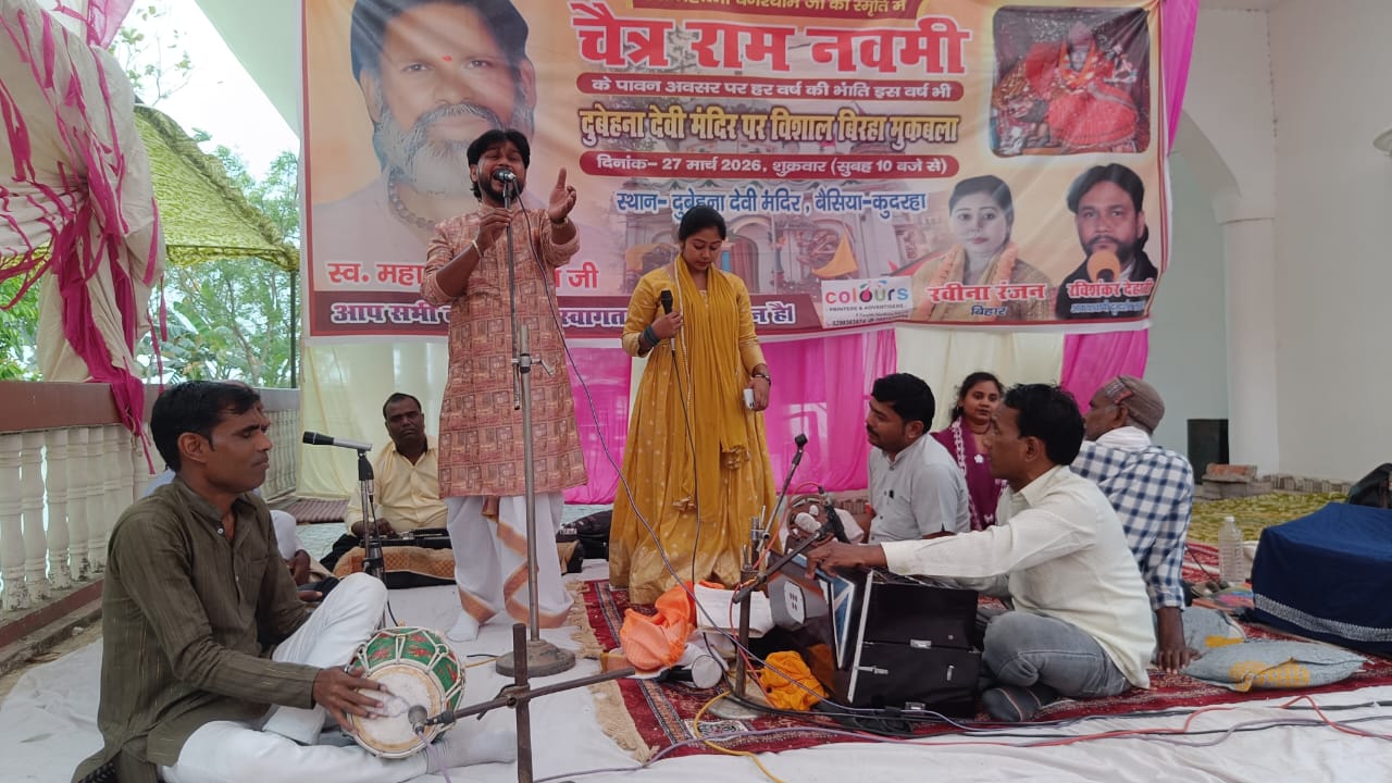 कुदरहा, बस्ती: राम नवमी के पावन अवसर पर दुबेहना देवी मंदिर परिसर में पूर्व ब्लाक प्रमुख व भाजपा पिछड़ा मोर्चा जिलाध्यक्ष ब्रह्मदेव यादव देव के नेतृत्व में जवाबी बिरहा का भव्य आयोजन किया गया। कार्यक्रम में देर शाम तक लोकगीतों की गूंज से वातावरण भक्तिमय और उत्साहपूर्ण बना रहा।