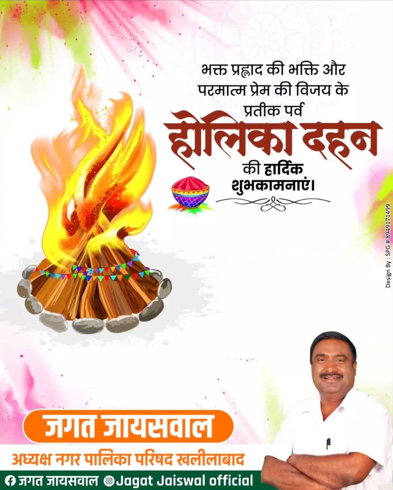 खलीलाबाद/संत कबीर नगर। नगर पालिका परिषद खलीलाबाद के अध्यक्ष जगत जायसवाल ने होली पर्व के अवसर पर नगरवासियों को अग्रिम शुभकामनाएं एवं बधाई दी है।