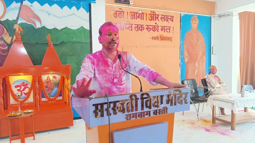 बस्ती। सरस्वती विद्या मंदिर वरिष्ठ माध्यमिक विद्यालय रामबाग बस्ती में आज आचार्यों और कर्मचारियों का होली मिलन समारोह आयोजित हुआ। मंच पर विद्यालय के प्रधानाचार्य श्री गोविंद सिंह के साथ विद्यालय के पूर्व_प्रधानाचार्य श्री अरविन्द सिंह जी की भी उपस्थिति रही।