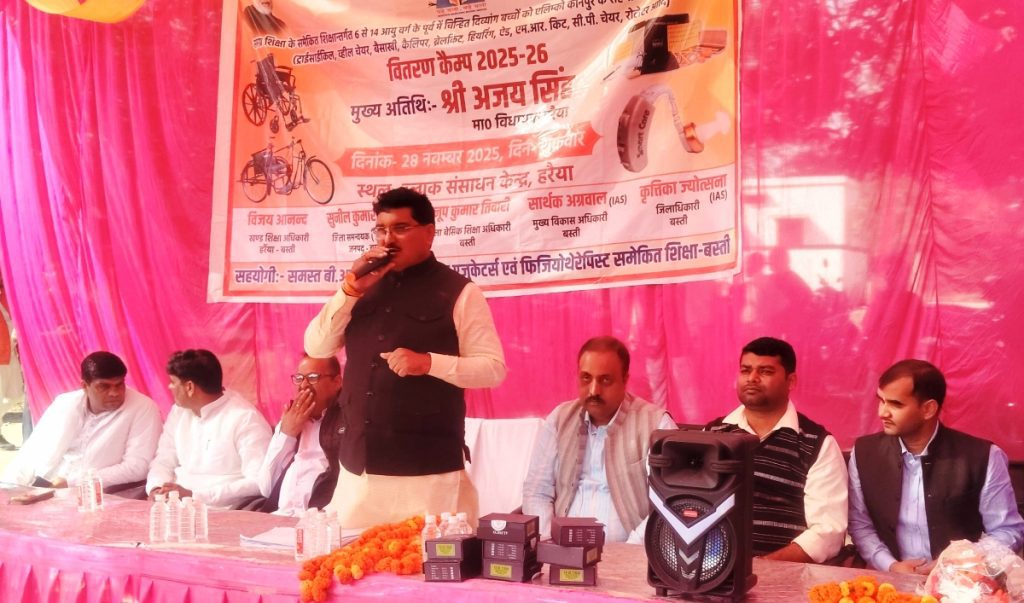 बस्ती। जूनियर हाईस्कूल हर्रैया के परिसर में शुक्रवार को 6 से 14 वर्ष तक के दिव्यांग बच्चों के लिए सहायक उपकरण वितरण कार्यक्रम का आयोजन किया गया। कार्यक्रम के मुख्य अतिथि स्थानीय विधायक अजय सिंह ने मां सरस्वती के चित्र पर माल्यार्पण और दीप प्रज्ज्वलित कर कार्यक्रम का शुभारंभ किया।