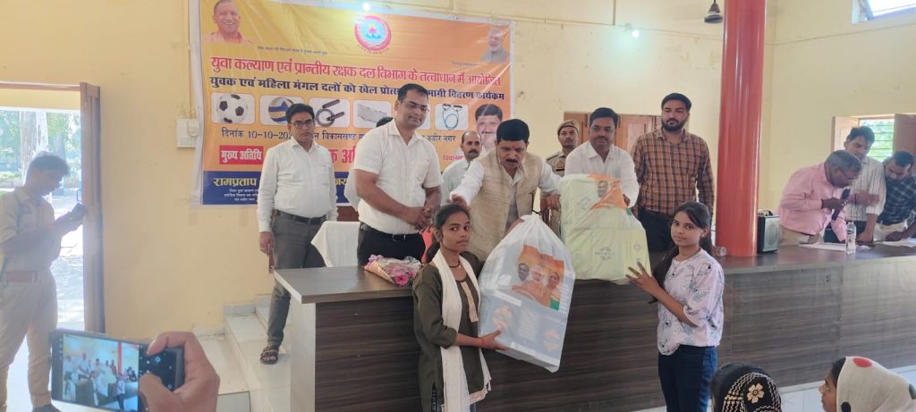 संत कबीर नगर। मा0 विधायक मेहदावल अनिल कुमार त्रिपाठी जी द्वारा विकास खंड सभागार मेंहदावल में युवा कल्याण एवं प्रांतीय रक्षक दल विभाग के तत्वाधान में आयोजित युवक एवम् महिला मंगल दलों को खेल प्रोत्साहन सामग्री का वितरण किया गया।