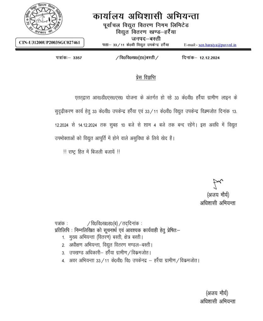 उत्तर प्रदेश टॉप समाचार बस्ती आवश्यक सूचना: 02 दिन बंद रहेगी इन बिजली घरों की पॉवर सप्लाई, सुबह 10 बजे ही गुल हो जाएगी बत्ती, देखें जारी प्रेस विज्ञप्ति। बंद रहेगी विद्युत आपूर्ति। Vijaydoot News December 12, 2024 Spread the love बस्ती समाचार.. देखें जारी प्रेस विज्ञप्ति – About the Author Vijaydoot News Editor View All Posts Spread the love Post navigation Previous: 90 प्रतिशत लोग गलत तरीके से खाते हैं गाजर, डायटीशियन से जानें सही तरीका।Next: डीएम की अध्यक्षता में ‘कबीर मगहर महोत्सव’ आयोजन से सम्बंधित दूसरी बैठक हुई आयोजित। Related Stories खेल समाचार टॉप समाचार नई दिल्ली राष्ट्रीय 10 लाख रुपये चाहिए गुजारा भत्ता, क्रिकेटर मोहम्मद शमी की पत्नी ने खटखटाया सुप्रीमकोर्ट का दरवाजा। Vijaydoot News November 7, 2025 उत्तर प्रदेश टॉप समाचार लखनऊ शिक्षा जगत यूपी में फर्जी डिग्री रैकेट मामले में ईडी की बड़ी कार्रवाई, 16 ठिकानों पर छापेमारी। Vijaydoot News November 7, 2025 टॉप समाचार नई दिल्ली राष्ट्रीय वंदे मातरम हमें प्रेरणा देता है आजादी की रक्षा कैसे करें, पीएम मोदी ने किया स्मरणोत्सव का उद्घाटन। Vijaydoot News November 7, 2025