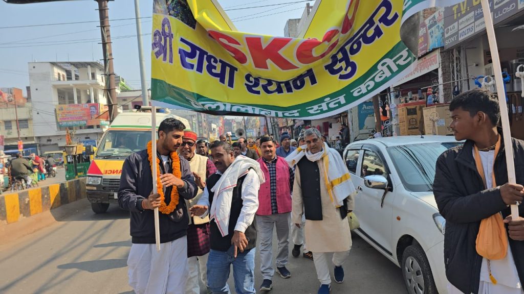संत कबीर नगर। बीते दिवस इस्कॉन संस्था के तत्वावधान में श्री राधा श्याम सुंदर मंदिर के भव्य निर्माण की योजना को लेकर विगत गुरुवार को धार्मिक उत्साह का माहौल देखने को मिला। इस अवसर पर खलीलाबाद के समय माता मंदिर चौराहे से बैंक चौराहे तक वृंदावन एवं गोरखपुर से आए श्रद्धालुओं, जिले के प्रतिष्ठित व्यवसायियों तथा नगर पालिका अध्यक्ष जगत जायसवाल की मौजूदगी में भव्य पैदल पदयात्रा निकाली गई।