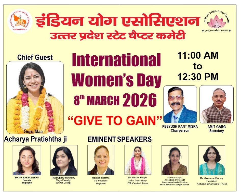 बस्ती। अंतरराष्ट्रीय महिला दिवस 2026 के अवसर पर इंडियन योग एसोसिएशन (आईवाईए) के उत्तर प्रदेश राज्य चैप्टर द्वारा ‘नारी शक्ति’ को समर्पित एक विशेष ऑनलाइन कार्यक्रम का आयोजन किया गया। यह कार्यक्रम 8 मार्च 2026 को जूम प्लेटफॉर्म के माध्यम से आयोजित हुआ, जिसमें योग से जुड़े विशेषज्ञों, साधकों तथा समाज के विभिन्न वर्गों के लोगों ने सहभागिता की।