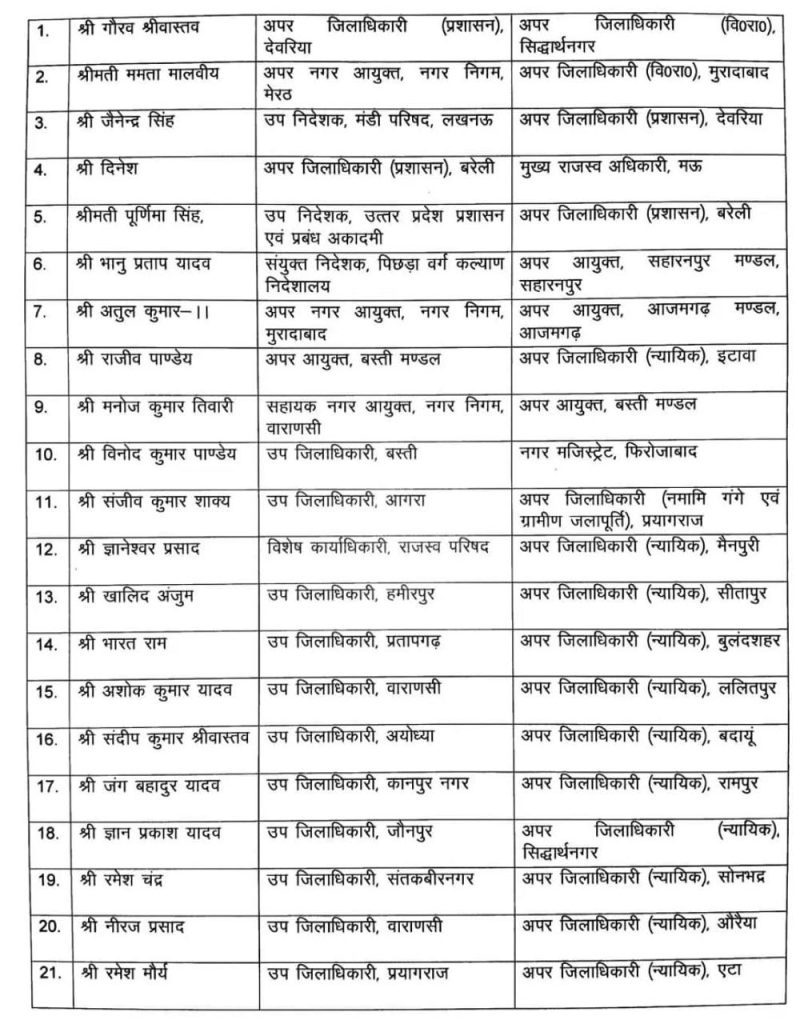 अपर जिलाधिकारी बरेली दिनेश को मऊ का मुख्य राजस्व अधिकारी बनाया गया है,बस्ती के उपजिलाधिकारी विनोद कुमार पांडेय को नगर मजिस्ट्रेट फिरोजाबाद बनाया गया है,आगरा के उपजिलाधिकारी संजीव कुमार शाक्य को अपर जिलाधिकारी प्रयागराज बनाया गया है।