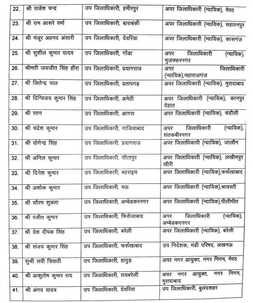 उपजिलाधिकारी हमीरपुर खालिद अंजुम को अपर जिलाधिकारी सीतापुर बनाया गया है, प्रतापगढ़ के उपजिलाधिकारी भारत राम को अपर जिलाधिकारी बुलंदशहर बनाया गया है, वाराणसी के उपजिलाधिकारी अशोक कुमार यादव को अपर जिलाधिकारी ललितपुर बनाया गया है।