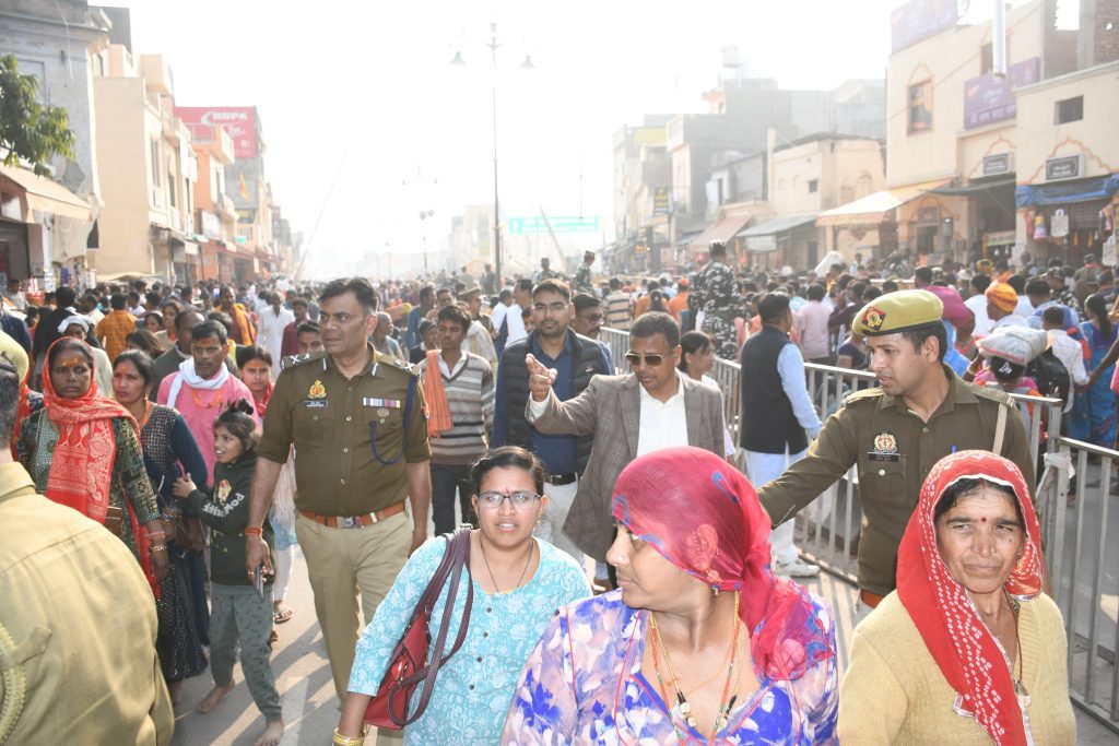 मण्डलायुक्त गौरव दयाल व आईजी प्रवीण कुमार ने महाकुम्भ 2025 के दौरान लाखों की संख्या में अयोध्या पहुंच रहे श्रद्वालुओं को उन्हें श्रीराम मंदिर के सुगम दर्शन आदि की व्यवस्था के सम्बंध में श्रीराम मंदिर परिसर सहित अन्य स्थलों का भौतिक अवलोकन किया। अधिकारी द्वय द्वारा श्रीराम मंदिर परिसर में सिंह द्वार, पीएफसी सेन्टर सहित अन्य प्रमुख स्थलों का निरीक्षण कर वहां उपस्थित सुरक्षा अधिकारियों को सुरक्षा के दृष्टि से आवश्यक दिशा निर्देश दिये गये। अगले चरण में अधिकारी द्वय द्वारा भक्ति पथ, हनुमानगढ़ी परिसर आदि का भी निरीक्षण किया गया। इस दौरान श्री हनुमानगढ़ी के दर्शन हेतु अपनी बारी का इंतजार कर रहे श्रद्वालुओं से उनके आगमन स्थान सहित अन्य बिन्दुओं के बारे में जानकारी प्राप्त करते हुये श्रद्वालुओं को प्रशासन के सहयोग का सहयोग करने के लिए धन्यवाद ज्ञापित किया गया। वही आईजी प्रवीण कुमार ने बताया है कि रोजाना लगभग 20 से 25 लाख श्रद्धालु अयोध्या पहुंच रहे हैं।