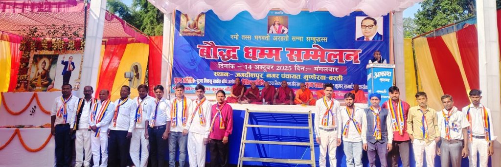 बस्ती। मंगलवार को अशोक धम्म विजय दशमी (दीक्षा दिवस) के अवसर पर नगर पंचायत, मुण्डेरवा के जगदीशपुर में बौद्ध धम्म सम्मेलन का आयोजन किय गया। मुख्य अतिथि पूज्य भिक्खु साकेत बोधी अयोध्या ने कहा कि बौद्ध धर्म में अहिंसा, शांति और विश्व समुदाय के सिद्धांत गहराई से जुड़े हुए हैं। अहिंसा बौद्ध धर्म का मूल सिद्धांत है कि सभी प्राणियों के प्रति करुणा और अहिंसा बरती जाए। यह न केवल शारीरिक हिंसा से बचने बल्कि मन और वचन से भी दूसरों को नुकसान न पहुंचाने पर जोर देता है।