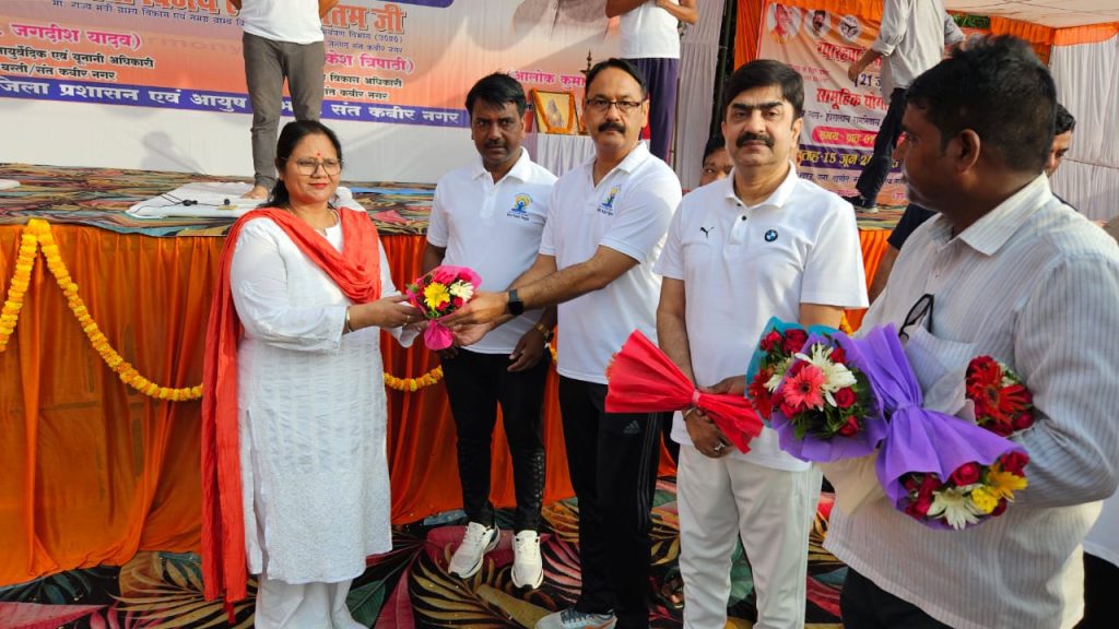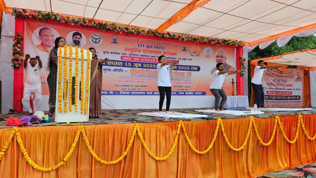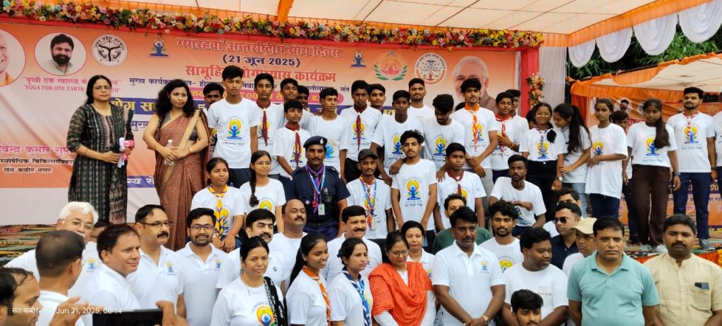 संत कबीर नगर। 11वां अन्तर्राष्ट्रीय योग दिवस के अवसर पर योगाभ्यास कार्यक्रम का भव्य आयोजन हीरालाल इण्टर कॉलेज के प्रांगण में किया गया। जिलाधिकारी आलोक कुमार के कुशल निर्देशन एव मार्गदर्शन में आयोजित किये गये योगाभ्यास कार्यक्रम में मुख्य अतिथि/प्रभारी मंत्री श्रीमती विजयलक्ष्मी गौतम, विशिष्ट अतिथि मा0 विधायक मेंहदावल अनिल कुमार त्रिपाठी, मा0 विधायक धनघटा गणेश चंद्र चौहान, मा0 जिला पंचायत अध्यक्ष बलिराम यादव, मंडलायुक्त बस्ती मंडल बस्ती अखिलेश सिंह, जिलाधिकारी आलोक कुमार व मुख्य विकास अधिकारी जयकेश त्रिपाठी ने योग दिवस कार्यक्रम का शुभारम्भ दीप प्रज्ज्वलित कर किया।