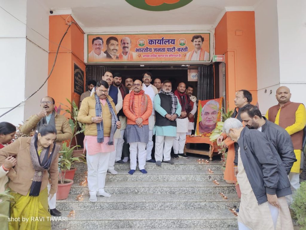 बस्ती। देश के पूर्व प्रधानमंत्री एवं भारत रत्न श्रद्धेय अटल बिहारी वाजपेयी जी के जन्म शताब्दी वर्ष की पूर्व संध्या के अवसर पर जनपद बस्ती में अटल बिहारी वाजपेयी प्रेक्षागृह एवं भारतीय जनता पार्टी कार्यालय पर भव्य दीपोत्सव कार्यक्रम का आयोजन किया गया। कार्यक्रम की अध्यक्षता भाजपा जिलाध्यक्ष विवेकानन्द मिश्र ने की, जबकि पूर्व सांसद हरीश द्विवेदी दोनों स्थानों पर बतौर मुख्य अतिथि उपस्थित रहे।