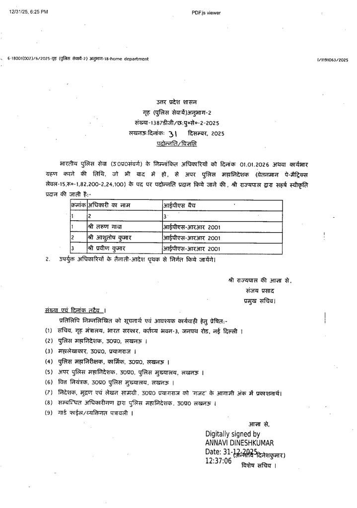लखनऊ। उत्तर प्रदेश शासन ने नए वर्ष से पूर्व भारतीय पुलिस सेवा (आईपीएस) अधिकारियों को बड़ी सौगात दी है। गृह (पुलिस सेवाएं) अनुभाग–2 द्वारा जारी अलग-अलग आदेशों के तहत राज्य कैडर के 40 से अधिक आईपीएस अधिकारियों को पदोन्नति प्रदान करने को राज्यपाल की स्वीकृति दे दी गई है। सभी पदोन्नतियां 01 जनवरी 2026 से प्रभावी होंगी अथवा संबंधित अधिकारी द्वारा कार्यभार ग्रहण करने की तिथि से लागू मानी जाएंगी।