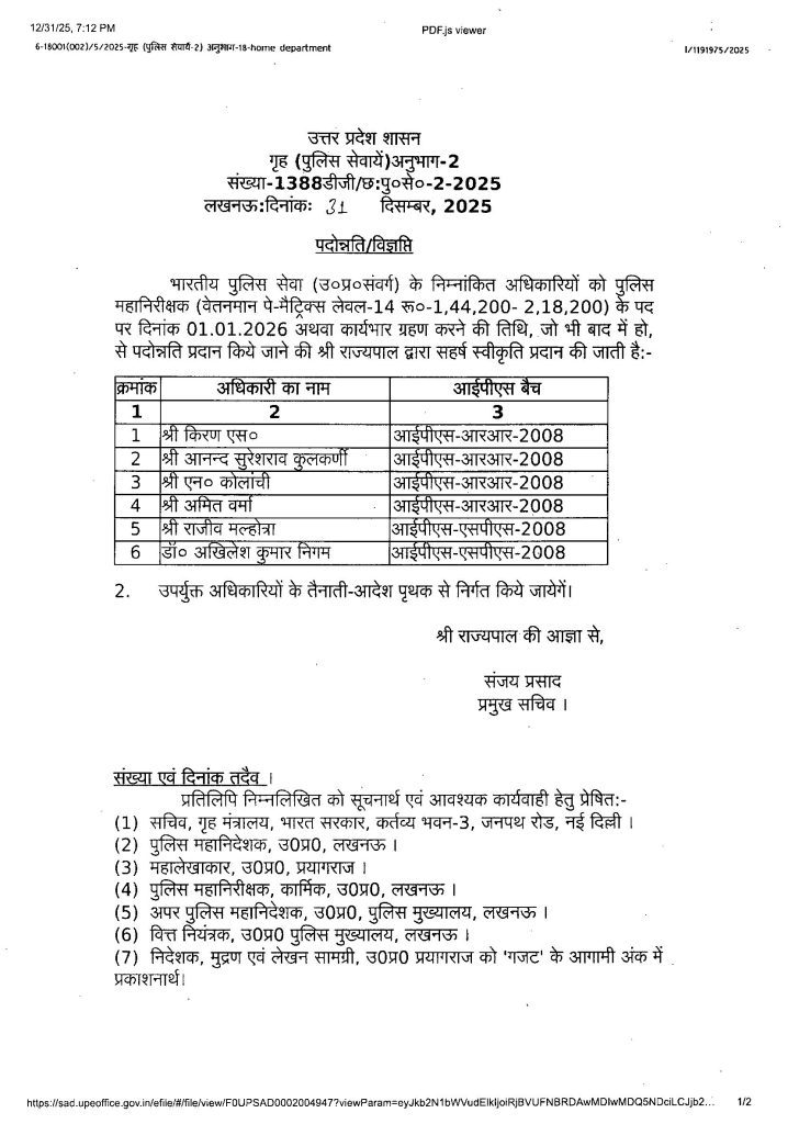 आईपीएस बैच 2001 के अधिकारियों को अपर पुलिस महानिदेशक (एडीजी), वेतनमान लेवल-15 (₹1,82,200–2,24,100) के पद पर पदोन्नति दी गई है।