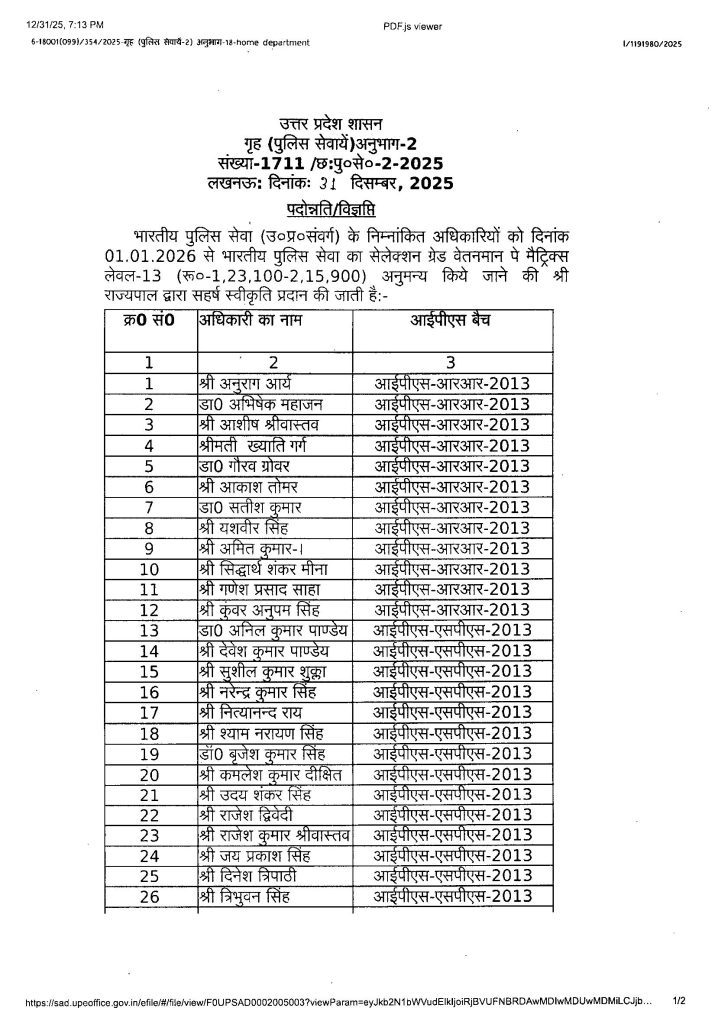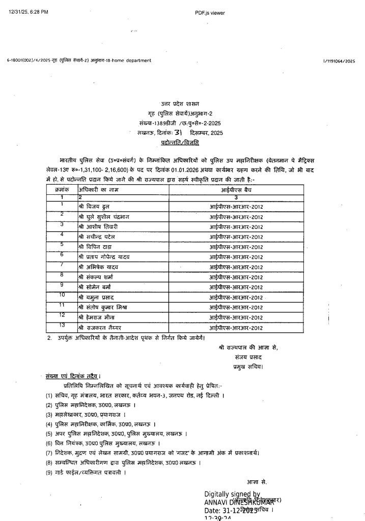 वहीं आईपीएस बैच 2013 के अधिकारियों को उप पुलिस महानिरीक्षक (डीआईजी), वेतनमान लेवल-13 (₹1,23,100–2,15,900) में प्रोन्नति प्रदान की गई है।
