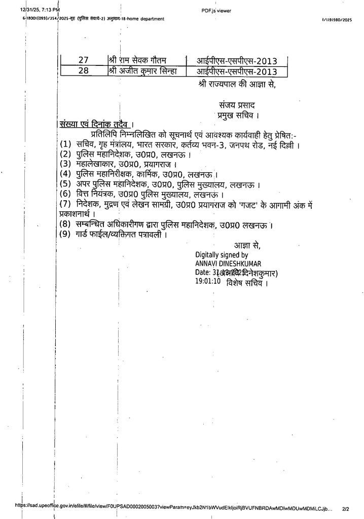 उत्तर प्रदेश शासन के इस निर्णय से पुलिस प्रशासन में वरिष्ठ स्तर पर नेतृत्व को मजबूती मिलेगी और कानून-व्यवस्था के प्रबंधन में अनुभव का बेहतर उपयोग हो सकेगा।