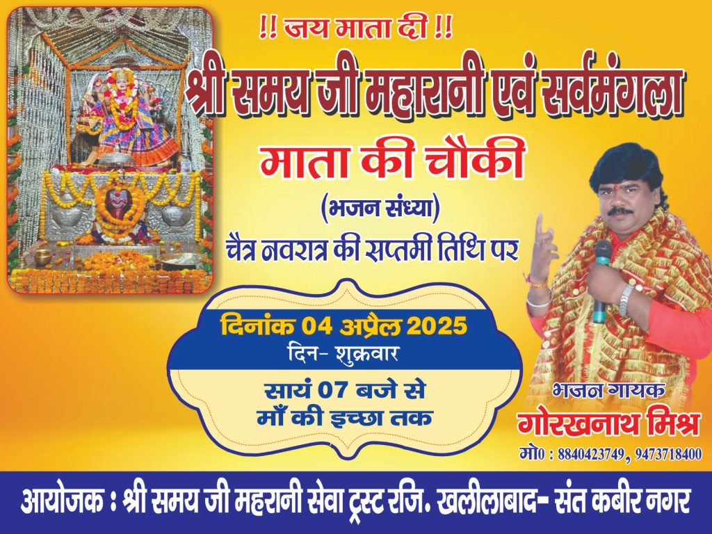 संत कबीर नगर। शहर के प्रतिष्ठित महारानी समय माता मंदिर में सप्तमी तिथि, 4 अप्रैल 2025 (शुक्रवार) को माता जी की चौकी का आयोजन किया जाएगा। यह आयोजन श्री स्वामी जी महारानी सेवा ट्रस्ट के तत्वावधान में किया जा रहा है।