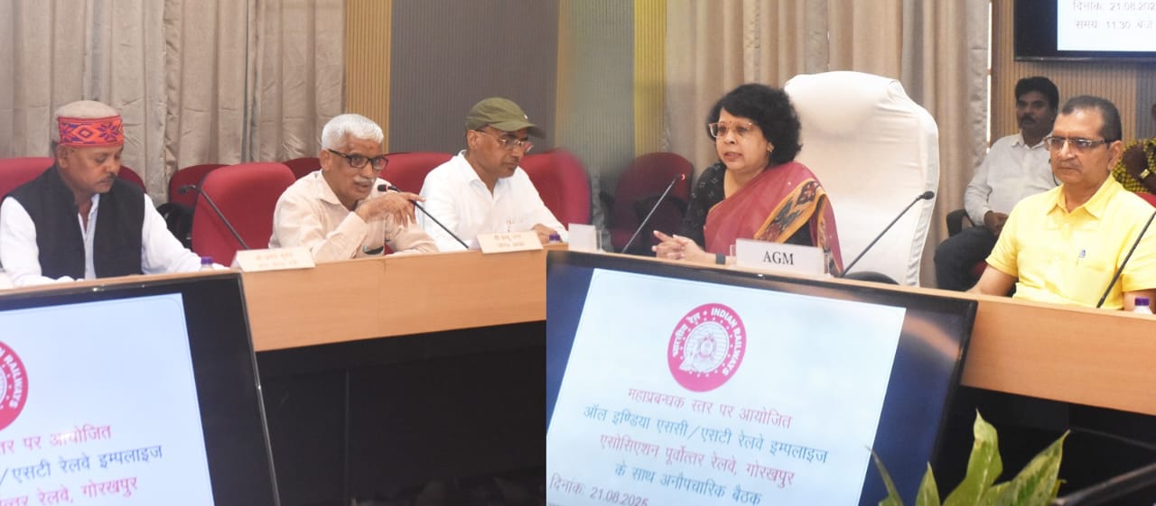 गोरखपुर। पूर्वोत्तर रेलवे के महाप्रबन्धक सुश्री सौम्या माथुर की अध्यक्षता में आल इण्डिया एससी/एसटी रेलवे इम्प्लॉइज एसोसियेशन के पदाधिकारियों के साथ एक अनौपचारिक बैठक महाप्रबन्धक सभाकक्ष, गोरखपुर में आयोजित हुई। बैठक में अपर महाप्रबन्धक श्री विनोद कुमार शुक्ल, प्रमुख विभागाध्यक्ष, वरिष्ठ रेल अधिकारी एवं एसोसियेशन पदाधिकारी उपस्थित थे।