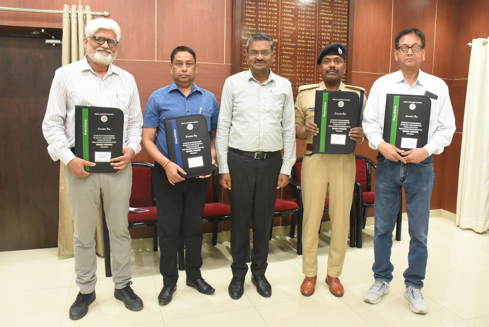 प्रमुख मुख्य कार्मिक अधिकारी श्री मनोज कुमार ने अपने कक्ष में आयोजित कार्यक्रम में उप मुख्य इंजीनियर/निर्माण श्री महेन्द्र नाथ मिश्र, सचिव/प्रमुख मुख्य परिचालन प्रबंधक श्री शैलेश कुमार सिंह, सहायक परिचालन प्रबंधक श्री अशोक कुमार मिश्र तथा सहायक सुरक्षा आयुक्त/रेलवे सुरक्षा बल श्री नरेन्द्र कुमार को सम्मानित किया। उन्होंने सभी सेवानिवृत्त अधिकारियों के स्वस्थ एवं सुखमय जीवन की कामना की।
