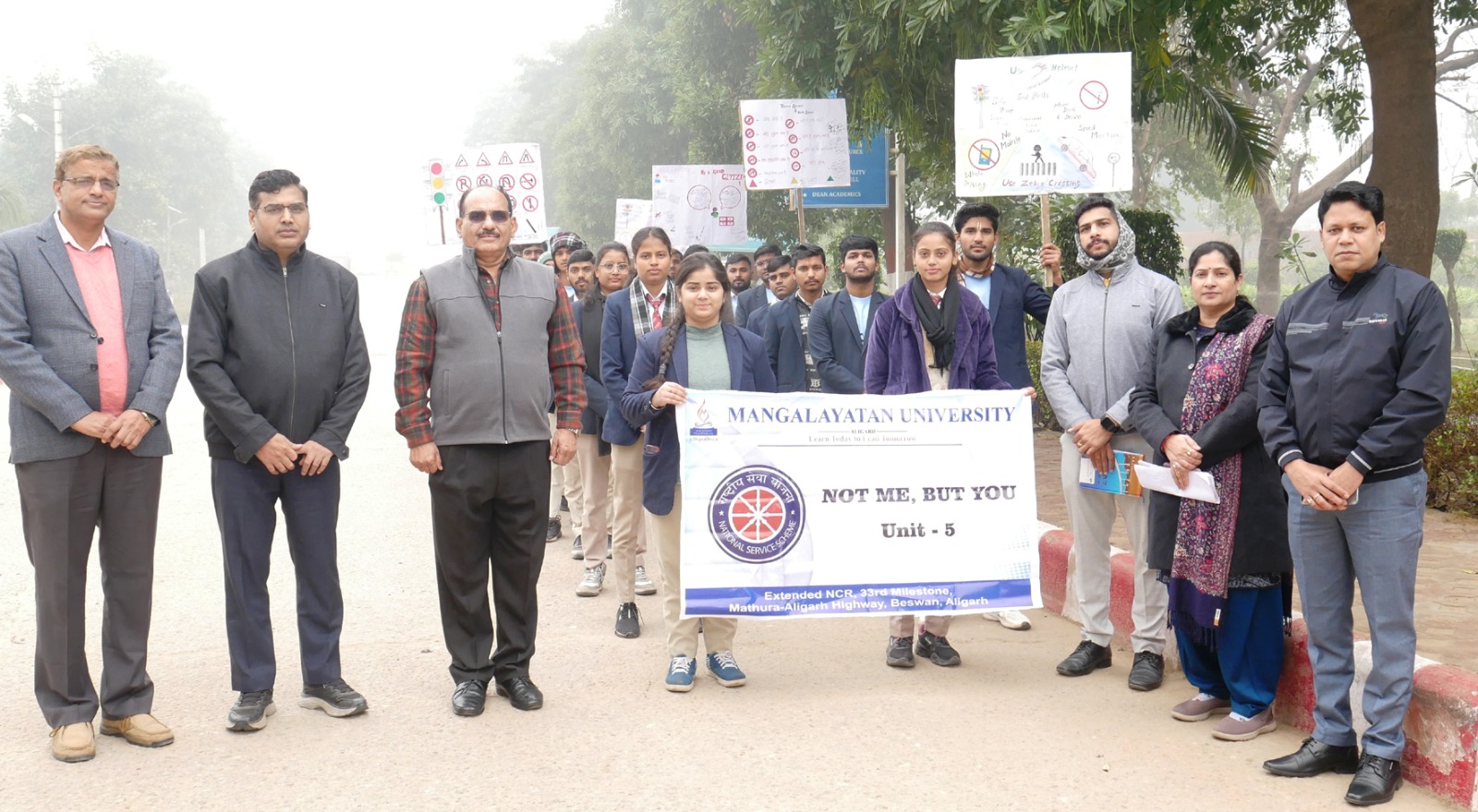 अलीगढ़। मंगलायतन विश्वविद्यालय में राष्ट्रीय सेवा योजना के स्वंयसेवकों ने सड़क सुरक्षा कार्यक्रम के तहत जनजागरूकता रैली निकाली। इस दौरान विश्वविद्यालय परिसर से नारे लगाते हुए निकले विद्यार्थियों ने सड़क सुरक्षा के प्रति लोगों को जागरुक किया और नियमों का पालन करने का संकल्प दिलाया। विद्यार्थियों ने हेलमेट व सीट बेल्ट न लगाकर वाहन चलाने वाले चालकों को फूल भेंट करके नियमों का पालन करने की सीख भी दी।