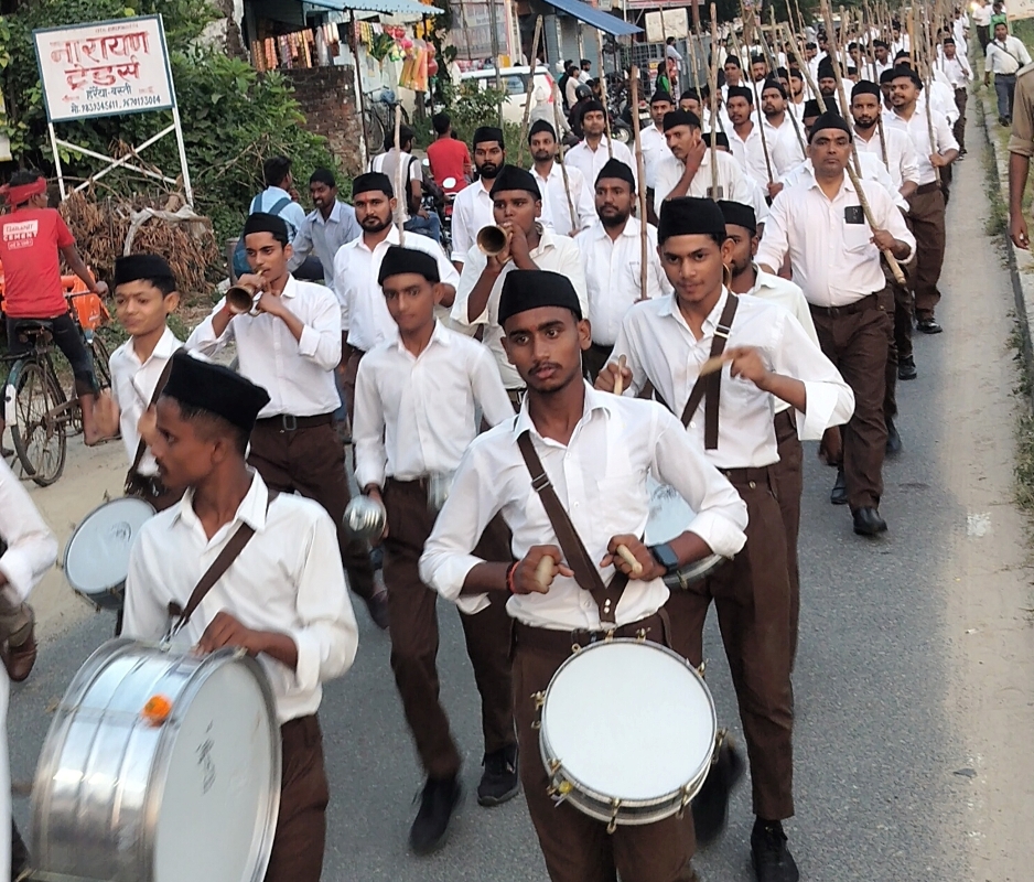 बस्ती। राष्ट्रीय स्वयंसेवक संघ (आरएसएस) के शताब्दी वर्ष पूर्ण होने के उपलक्ष्य में हर्रैया कस्बे में पंथ संचलन कार्यक्रम आयोजित किया गया। संघ के गणवेश में स्वयंसेवकों ने नगर की सड़कों पर कदमताल की। स्थानीय लोगों ने यात्रा पर पुष्प वर्षा कर स्वयंसेवकों का स्वागत किया। बैंड बाजे की मधुर धुन और केसरिया ध्वजों की शोभा से संपूर्ण कस्बा राष्ट्रभक्ति के रंग में रंग गया।