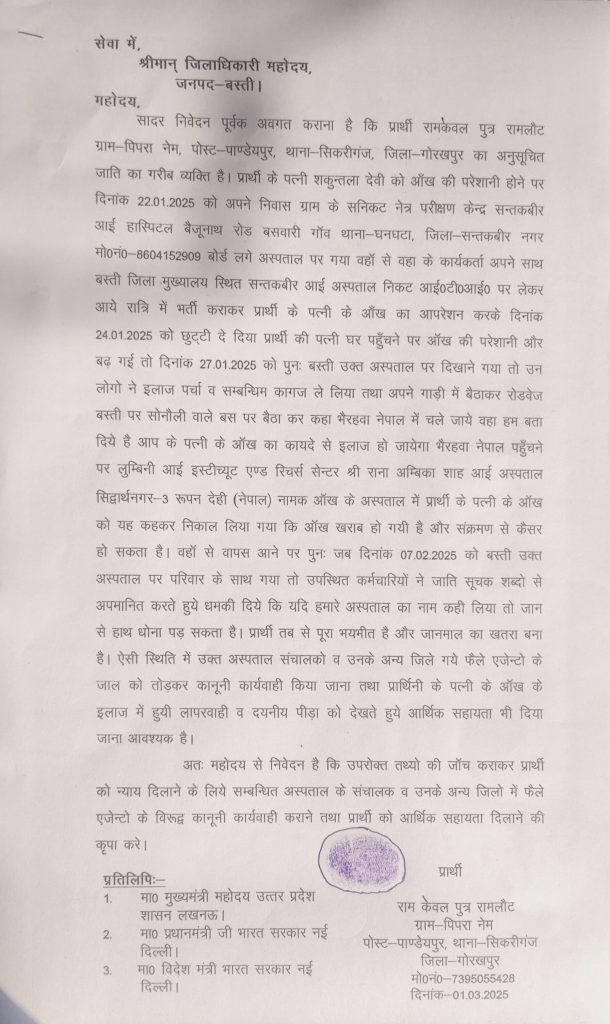 वहां मौजूद लोग बस्ती जिला मुख्यालय पर बड़ेवन स्थित संतकबीर आई हॉस्पिटल ले आये। यहां डाक्टरों ने आंख का आपरेशन किया और मरीज को 24 जनवरी को छुट्टी दे दी। घर पहुंचने पर आंख की परेशानी और बढ़ गई। 27 जनवरी को पुनः बस्ती संतकबीर आई हॉस्पिटल लेकर आये। उस दिन हॉस्पिटल के लोगों ने दवाइयों का परचा और जांच रिपोर्ट सब ले लिया और सोनौली वाले बस पर बैठाकर भैरहवां जाकर आंख दिखाने की सलाह दिया। वहां लुम्बिनी आई इन्स्टीट्यूट एण्ड रिसर्च सेन्टर श्री राना अम्बिका शाह आई हॉस्पिटल के डाक्टरों ने कहा इंफेक्शन फैल चुका है, आंख नही निकाली गई तो कैंस होने का खतरा है। मजबूर होकर आंख निकलवानी पड़ी। वापस पुनः 07 फरवरी को संतकबीर आई हॉस्पिटल-बसती पहुंचे, डाक्टर को सारी जानकारी दी।