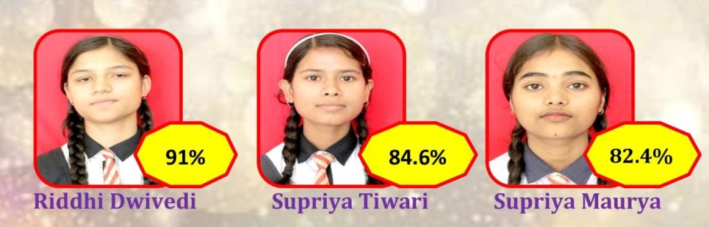 कक्षा 12वीं में रिद्धि द्विवेदी ने 91% अंक प्राप्त कर विद्यालय में प्रथम स्थान प्राप्त किया। उन्होंने केमिस्ट्री में शत-प्रतिशत अंक (100/100) हासिल कर सभी को गौरवान्वित किया। सुप्रिया तिवारी ने 84.60% और सुप्रिया मौर्या ने 84.40% अंकों के साथ क्रमशः दूसरा और तीसरा स्थान प्राप्त किया।