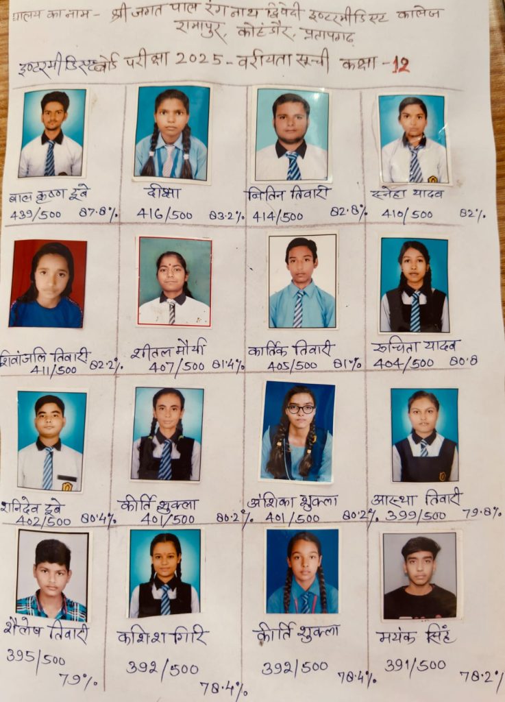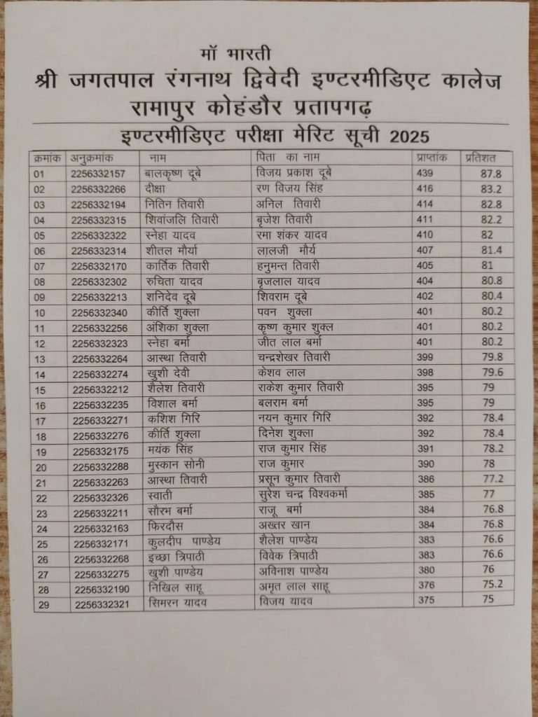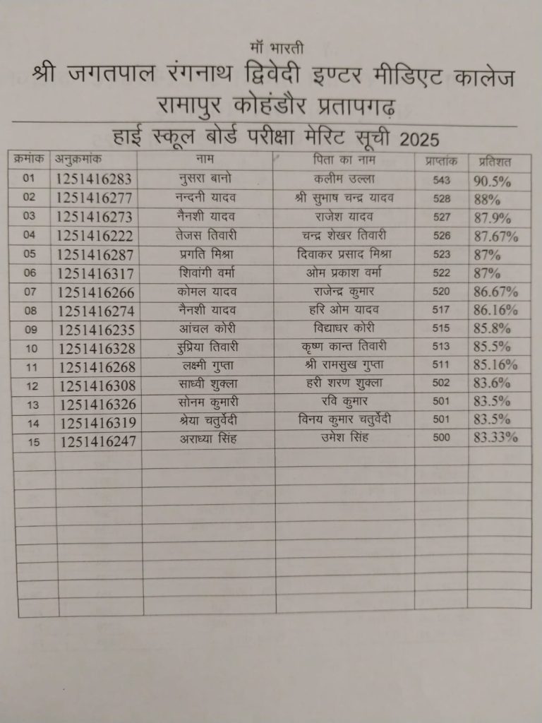 प्रतापगढ़। उत्तर प्रदेश माध्यमिक शिक्षा परिषद (UPMSP) द्वारा शुक्रवार को जारी किये गए हाईस्कूल और इंटरमीडिएट परीक्षा परिणाम में श्री जगतपाल रंगनाथ द्विवेदी इंटरमीडिएट कॉलेज, रामापुर कोहंडौर के छात्रों ने उत्कृष्ट प्रदर्शन किया है। छात्रों ने विगत वर्षों की भांति इस वर्ष के शैक्षिक सत्र 2024-2025 में भी हाईस्कूल और इंटरमीडिएट परीक्षाओं में शानदार प्रदर्शन कर एक बार फिर जनपद व क्षेत्र में विद्यालय का नाम रोशन किया है।