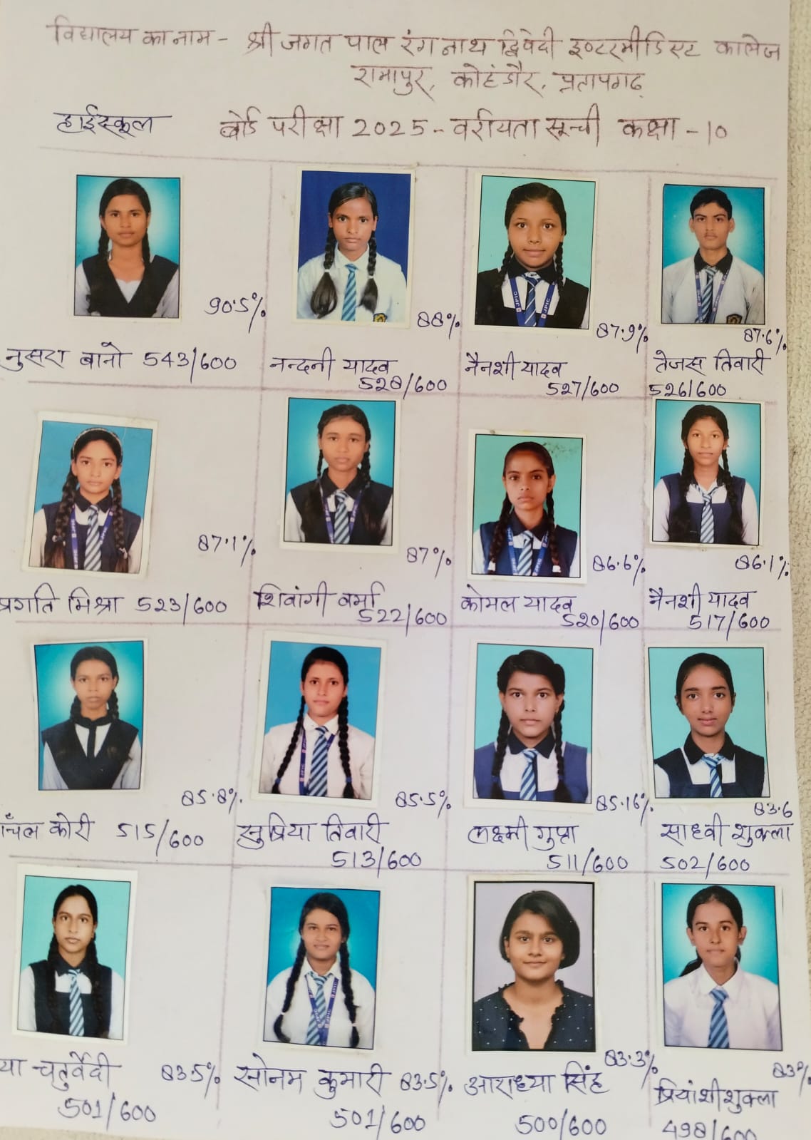 प्रतापगढ़। उत्तर प्रदेश माध्यमिक शिक्षा परिषद (UPMSP) द्वारा शुक्रवार को जारी किये गए हाईस्कूल और इंटरमीडिएट परीक्षा परिणाम में श्री जगतपाल रंगनाथ द्विवेदी इंटरमीडिएट कॉलेज, रामापुर कोहंडौर के छात्रों ने उत्कृष्ट प्रदर्शन किया है। छात्रों ने विगत वर्षों की भांति इस वर्ष के शैक्षिक सत्र 2024-2025 में भी हाईस्कूल और इंटरमीडिएट परीक्षाओं में शानदार प्रदर्शन कर एक बार फिर जनपद व क्षेत्र में विद्यालय का नाम रोशन किया है।