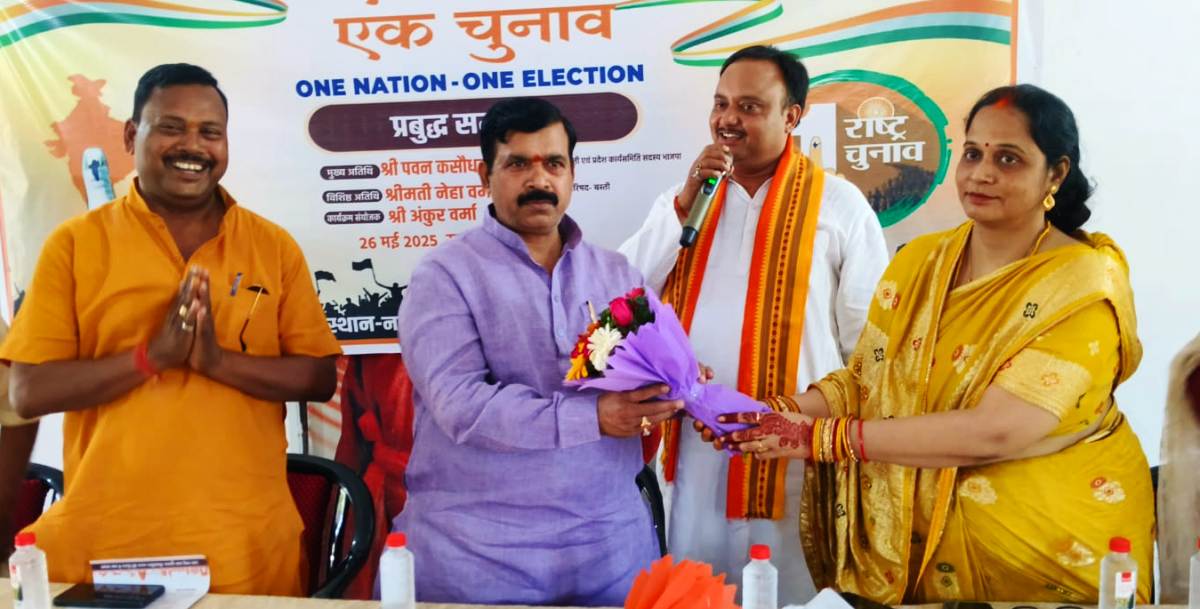 बस्ती। नगरपालिका परिषद के सभागार में सोमवार को ‘एक देश, एक चुनाव’ विषय पर प्रबुद्ध समागम का आयोजन किया गया। कार्यक्रम का संयोजन भाजपा वरिष्ठ नेता एवं संयोजक अंकुर वर्मा ने किया। मुख्य वक्ता के रूप में भाजपा के पूर्व जिलाध्यक्ष एवं ‘वन नेशन वन इलेक्शन’ गोष्ठी के जिला समन्वयक पवन कसौधन ने कहा कि यह अवधारणा संविधान की मूल भावना को पुनर्स्थापित करने की दिशा में एक सार्थक पहल है।
