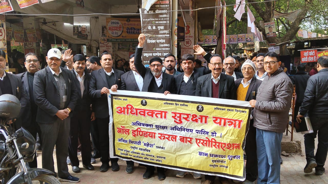 वाराणसी। अधिवक्ता सुरक्षा अधिनियम को संसद में पारित कराए जाने की मुहिम गुरूवार को वाराणसी में धार लिए दिखी। आल इण्डिया रूरल बार एसोसिएसन के बैनरतले लखनऊ से रायबरेली, उन्नाव, कानपुर, कौशाम्बी, फतेहपुर, जौनपुर होते हुए दोपहर बाद अधिवक्ता सुरक्षा यात्रा यहां कलेक्टेªट कचहरी पहुंची।