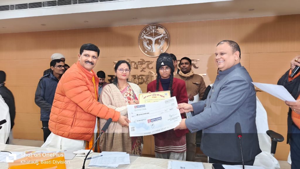 मा0 मंत्री जी द्वारा समीक्षा के दौरान आज राष्ट्रीय बालिका दिवस के अवसर पर बेटी बचाओं बेटी पढ़ाओं योजनान्तर्गत हाईस्कूल एवं इण्टरमीडिएट टॉप 10 में स्थान प्राप्त करने वाली हाईस्कूल के 07 एवं इण्टर 06 की छात्राओं को 05 हजार रूपये का चेक एवं प्रशस्ति पत्र देकर सम्मानित किया गया।