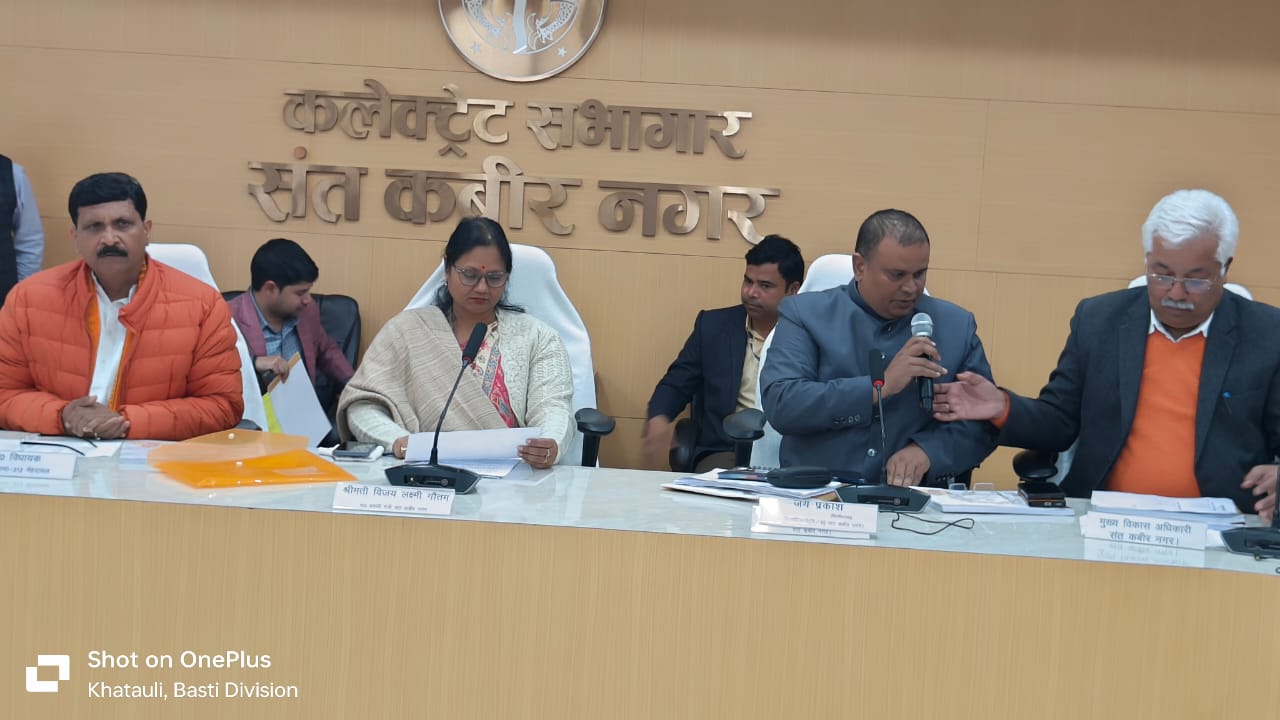 मा0 मंत्री जी कहा कि हम सभी का उद्देश्य जनपद संत कबीर नगर का सर्वांर्गीण विकास, भ्रष्टाचार मुक्त कार्य के साथ-साथ सरकार की योजनाओं का प्रचार-प्रसार कराना एवं नियमानुसार पात्रों को योजनाओं का लाभ दिलाना है। किसी भी स्तर पर उन्हें भ्रमित न करते हुए पूरी निष्पक्षता एवं पारदर्शिता के साथ पात्र व्यक्तियों को लाभान्वित किया जाए। उन्होंने कहा कि जनपद के ग्रामीण क्षेत्रों से आने वाले माताओं, बहनों सहित सभी फरियादियों की शिकायतों का त्वरित एवं गुणवत्तापूर्ण निस्तारण सुनिश्चित कराते हुए उसका फीड बैक भी लिया जाए। उन्होंने प्रशासन से महिलाओं, बेटियों का सम्मान, सुरक्षा एवं स्वालम्बन तथा गरीबों एवं वंचितों को लाभ एवं न्याय दिलाये जाने की अपेक्षा व्यक्त किया। जिलाधिकारी महेन्द्र सिंह तंवर ने जनपद के विकास हित में कराये जा रहे कार्याे एवं आगामी योजनाओं के बारे में मा0 मंत्री जी को अवगत कराया।