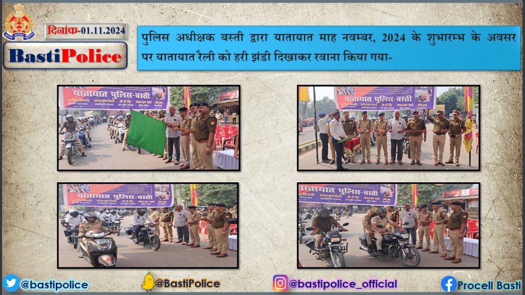 यातायात यातायात माह नवंबर 2024 का आयोजन अपर पुलिस महानिदेशक गोरखपुर जोन गोरखपुर केएस प्रताप कुमार, आईजी बस्ती परिक्षेत्र आरके भारद्वाज के निर्देशन में आयोजित किया गया। इस मौके पर शुक्रवार को बस्ती के पुलिस अधीक्षक गोपाल कृष्ण चौधरी, अपर पुलिस अधीक्षक बस्ती ओम प्रकाश सिंह, क्षेत्राधिकारी सदर व यातायात सत्येंद्र भूषण तिवारी के साथ शहर के शास्त्री चौक पहुंचे। यहां पुलिस अधीक्षक ने अधिकारियों के साथ यातायात रैली को हरी झंडी दिखाकर रवाना किया। इस दौरान पुलिस अधीक्षक ने लोगों को यातायात सुरक्षा के बारे में जागरूक भी किया और सभी से यातायात नियमों का पालन करने का निर्देश दिया।