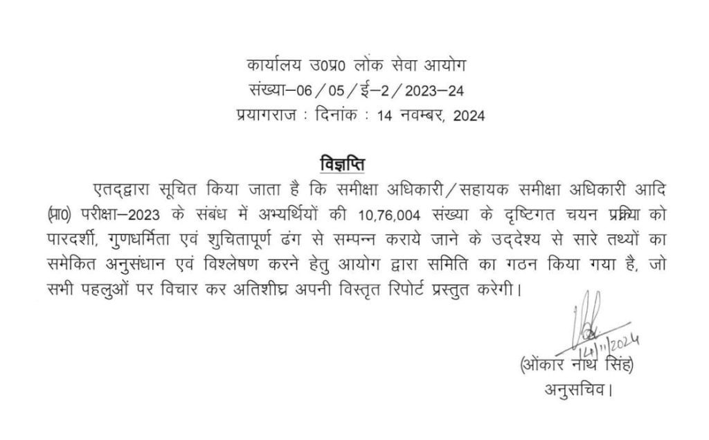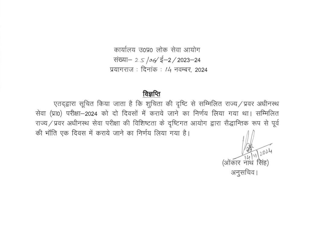 खबर के मुताबिक, प्रयागराज में प्रतियोगी छात्रों की मांग का मुख्यमंत्री योगी आदित्यनाथ ने संज्ञान लिया और आयोग को छात्रों के साथ संवाद कर और समन्वय बनाकर आवश्यक निर्णय लेने को कहा था। इसके बाद यूपीपीएससी ने अपना फैसला बदलते हुए पीसीएस प्रारंभिक परीक्षा 2024 को एक दिन में कराए जाने का निर्णय लिया है। इसके अलावा आरओ/एआरओ(प्रा.)परीक्षा-2023 के लिए आयोग की ओर से समिति का गठन किया गया है। समिति सभी पहलुओं पर विचार कर जल्द से जल्द अपनी विस्तृत रिपोर्ट प्रस्तुत करेगी।